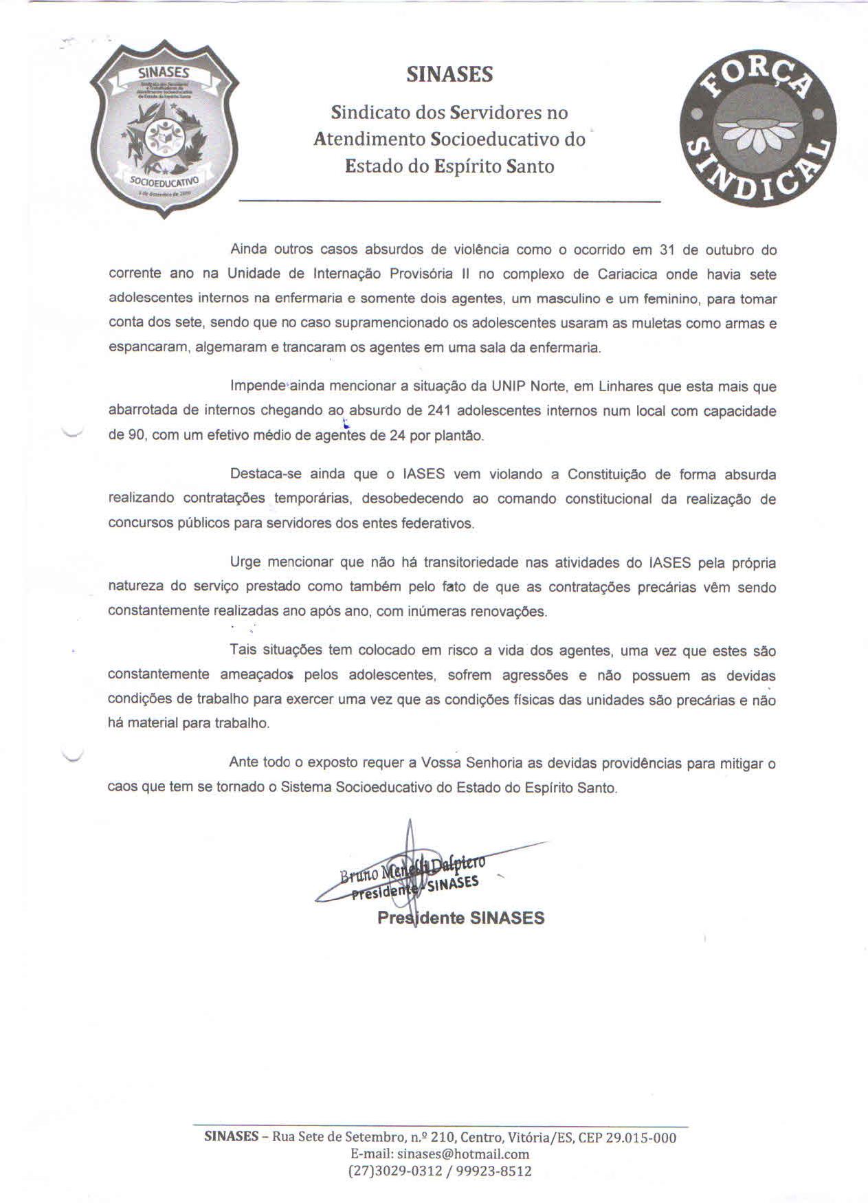 O SINASES, em cumprimento de seu estatuto, vem fiscalizando as irregularidades que são rotineiras e intermitentes no IASES. Todos os sinistros que acontecem são devidamente documentados e comunicados ao Ministério Público Estadual e demais órgãos de fiscalização como a Comissão de Segurança da Assembleia Legislativa e Coordenadoria da Área Infracional e Execução de Medidas Socioeducativas.O último ofício foi enviado no dia 03 de novembro de 2015. O SINASES informou: